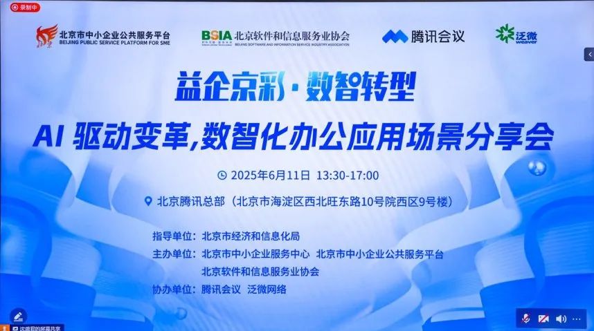 为积极响应国家及北京市关于推动数字经济发展的战略部署,6月11日,“益企京彩・数智转型”AI 驱动变革,数智化办公应用场景分享会在腾讯总部顺利举行。此次活动由北京市经济和信息化局指导,北京市中小企业服务中心、北京市中小企业公共服务平台、北京软件和信息服务业协会主办,腾讯会议、泛微网络协办,吸引了近百家北京市专精特新企业及国家小巨人企业代表参与,在推动企业数智化转型的同时,为大中小企业融通发展提供了新的思路与契机。